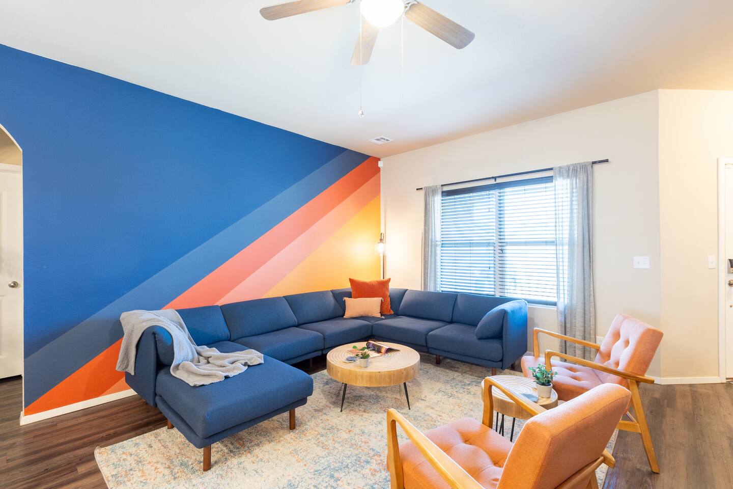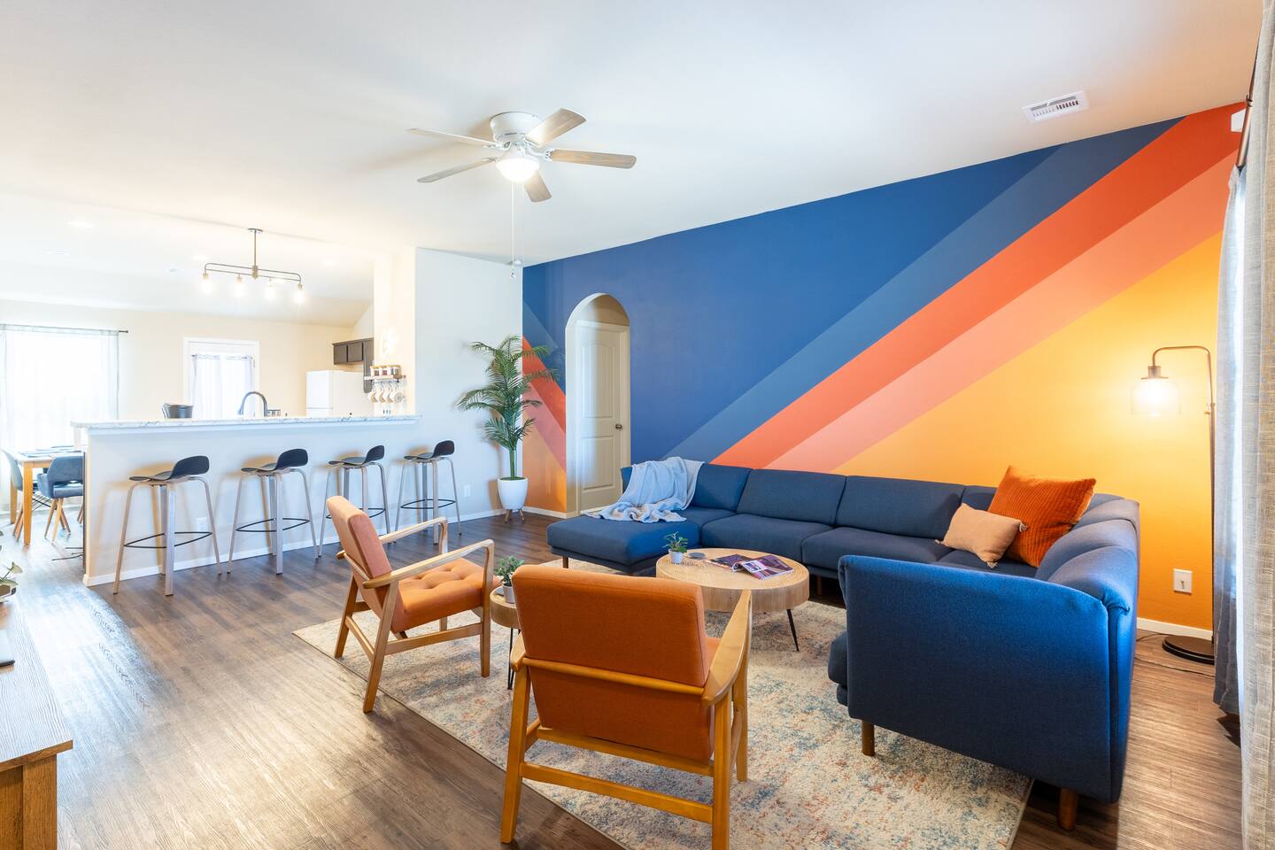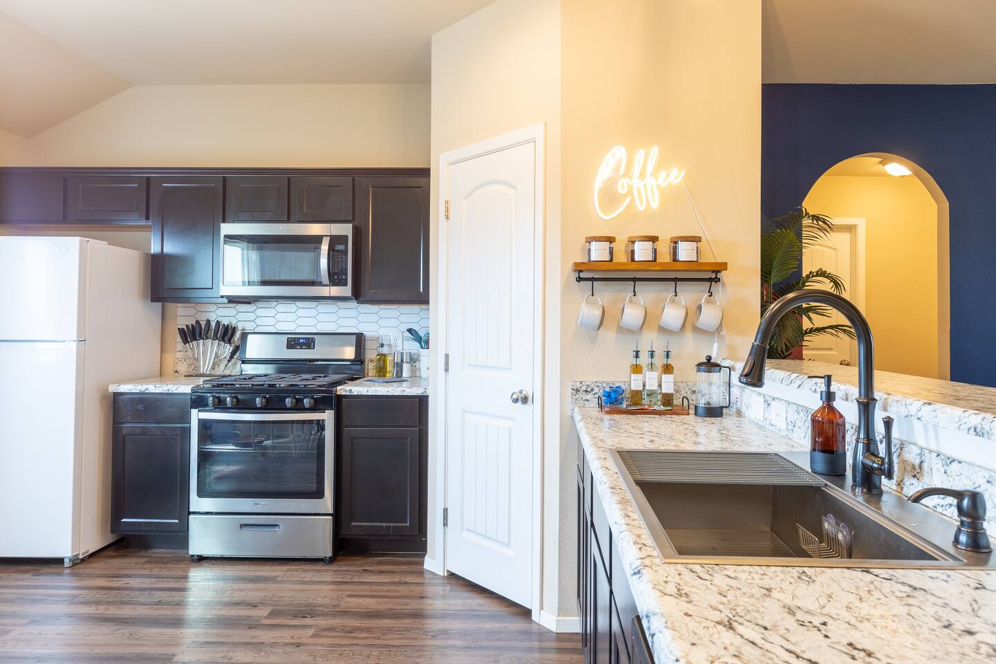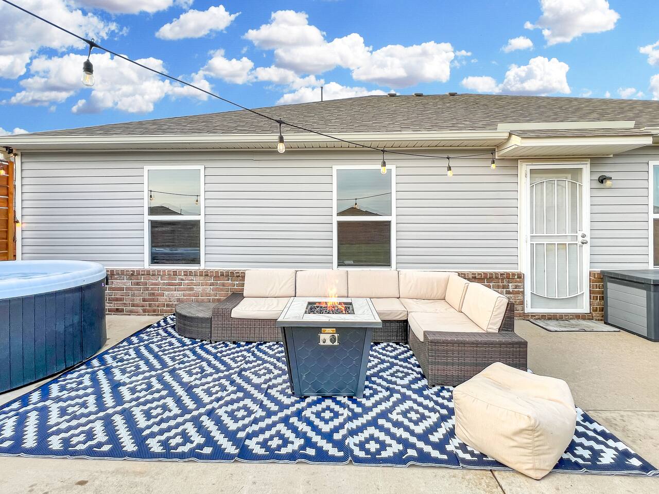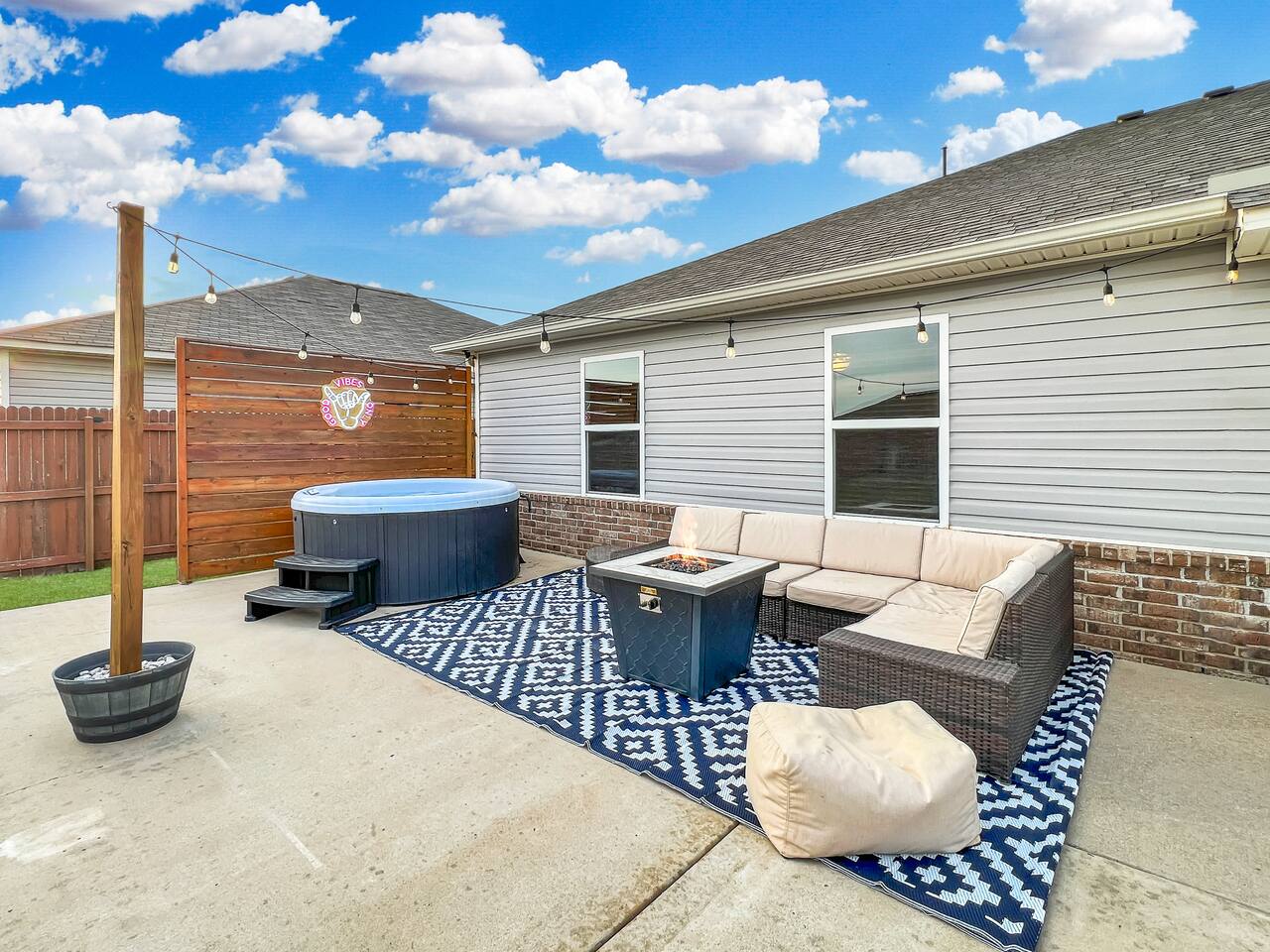 The Good Vibes Getaway is newly built and decorated with mid century modern furnishings & design. On the back patio, you can enjoy the Oklahoma sunset with a 6 person hot tub, fire pit table and string lights draped from a wood panel backdrop. LIVING AREA The colorful living room is the heartbeat of the open concept design, offering a unique and upbeat setting to relax between exciting Broken Arrow adventures. ✔ Large Modular Burrow Sectional ✔ 65" Amazon Fire TV ✔ FREE Netflix, Amazon Prime & Hulu ✔ High Speed Wi-Fi (500mb+) ✔ Board games & cards ✔ Record player with records PRIVATE BACKYARD Start your day recharging around the fire pit with a coffee from the coffee bar and end your night by unwinding in the 6-person Nordic hot tub! ✔ 6 person Hot Tub ✔ Patio with Outdoor Furniture & Fire Pit Table ✔ Gas Grill ✔ Corn Hole & Yard Games KITCHEN + DINING Open up the ample cabinetry to find everything you need to treat your family to their favorite meals. Coffee & Tea Bar ✔ Coffee Maker ✔ French Press ✔ Coffee Grinder ✔ 3 Different Coffee varieties ✔ Coffee Syrups & Creamer ✔ Electric Kettle Appliances ✔ Toaster ✔ Blender ✔ Mixer ✔ Instant Pot Kid-Friendly Items ✔ High Chair ✔ Kids Dinnerware ✔ Kids Utensils & Plates Fully Equipped Kitchen ✔ Chef knife set (17 pieces) ✔ Circulon Pots & Pans ✔ Silicone Cooking Utensils ✔ Silverware & Dinnerware ✔ Cutting Boards ✔ Mixing Bowls ✔ Tupperware ✔ Measuring Cup Set ✔ Spice Rack ✔ Olive oil, Salt & Pepper ✔ Baking & Pizza Pans ✔ Oven Mitts ✔ Wine Glasses ✔ Wine & Bottle Opener ✔ Other Utensils (Can Opener, Pizza Cutter, Grater, etc.) BEDROOMS Retreat to three comfortable bedrooms to rest for the night. ✔ Memory Foam Mattress ✔ Soft & Firm Pillows ✔ Night Stands with Reading Lamps ✔ Pack n' Play (Travel Crib) BATHROOMS Each bathroom is stocked with essential toiletries. Fresh towels are provided in the bedrooms and laundry room. ✔ Walk-In Shower (master) ✔ Makeup Mirror ✔ Makeup Towels ✔ Hair Dryer ✔ Flat Iron ✔ Essential Toiletries OTHER AMENITIES ✔ Iron & Ironing Board ✔ Vacuum ✔ Cleaning Supplies ✔ First Aid Kit