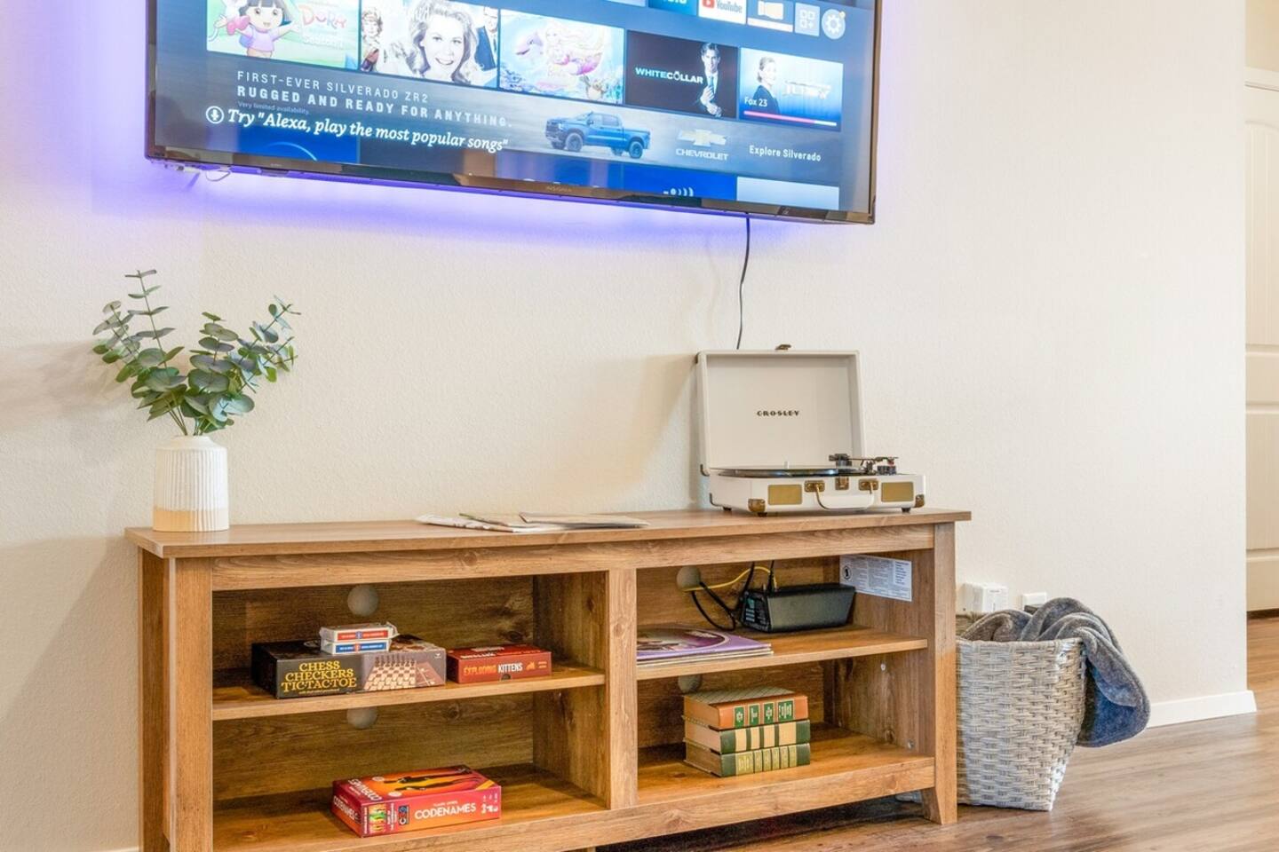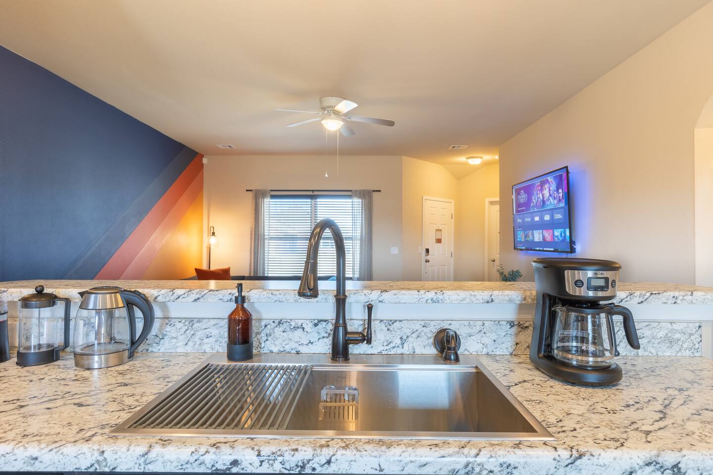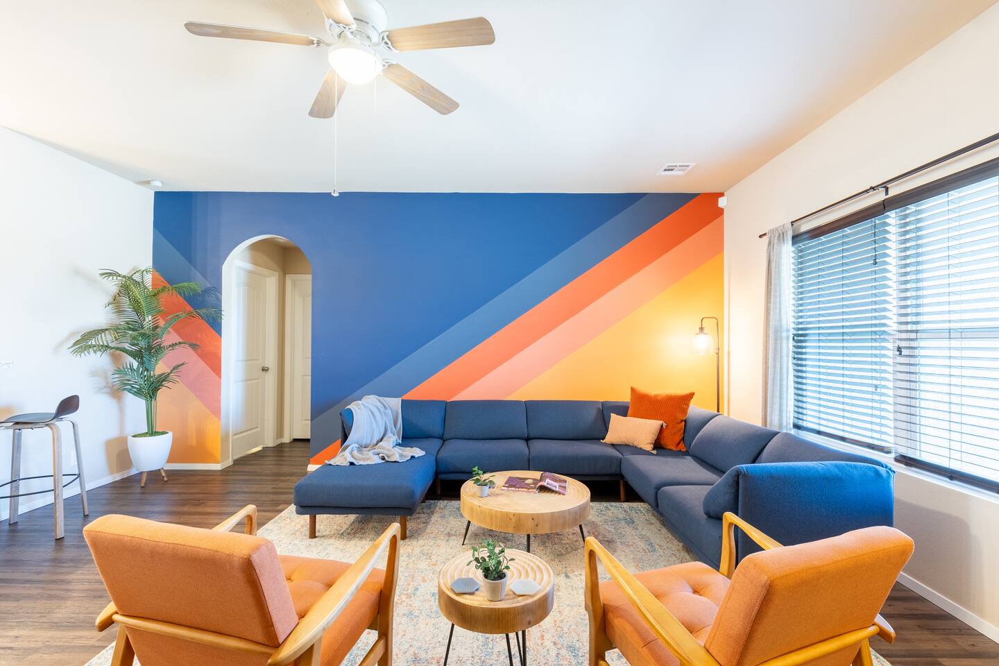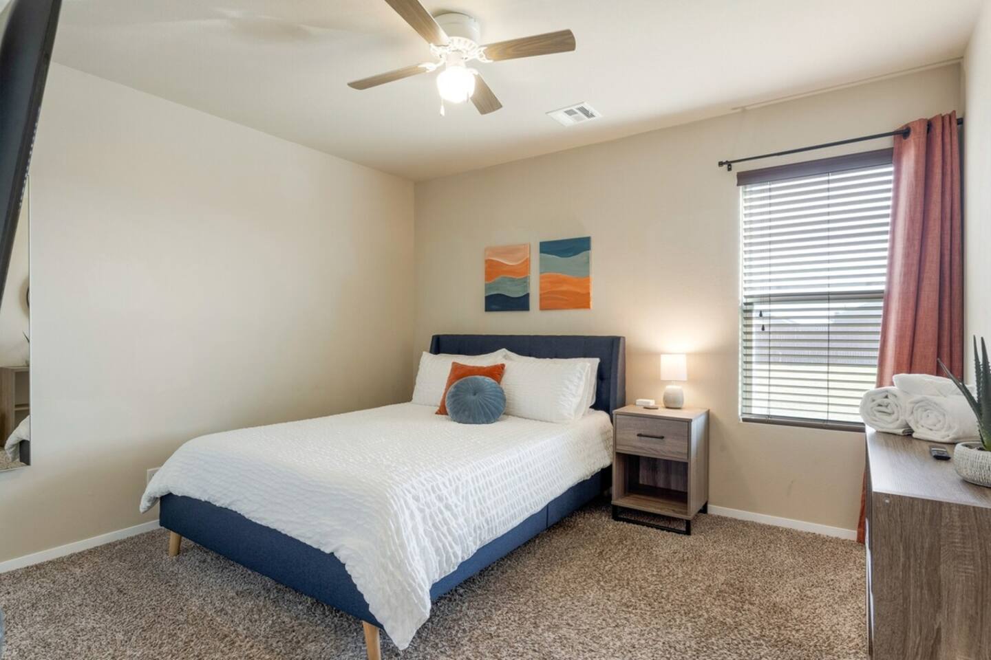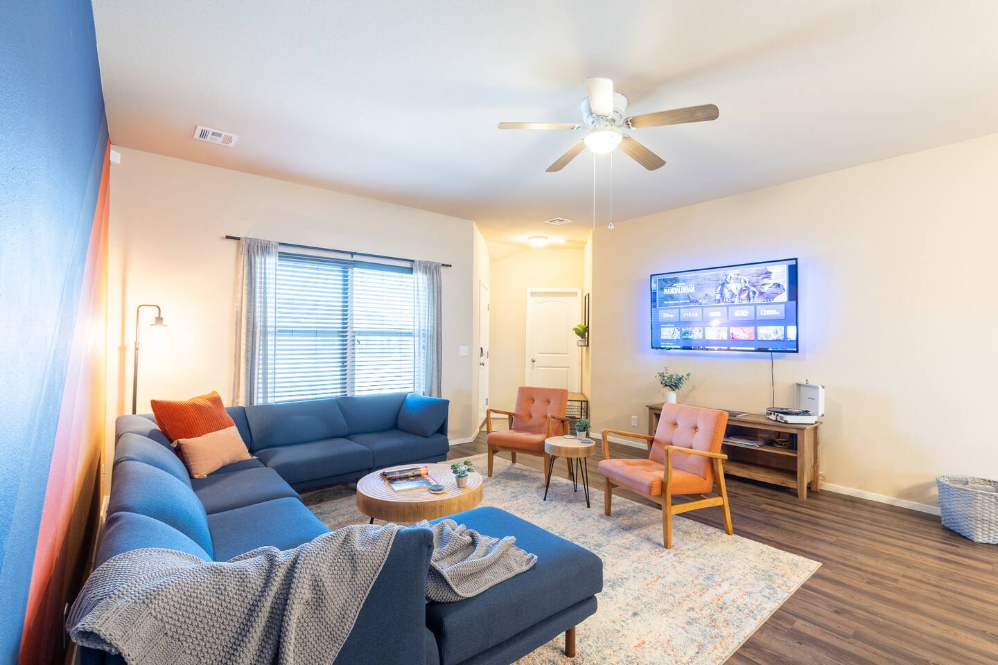 The Good Vibes Getaway is newly built and decorated with mid century modern furnishings & design. On the back patio, you can enjoy the Oklahoma sunset with a 6 person hot tub, fire pit table and string lights draped from a wood panel backdrop. LIVING AREA The colorful living room is the heartbeat of the open concept design, offering a unique and upbeat setting to relax between exciting Broken Arrow adventures. ✔ Large Modular Burrow Sectional ✔ 65" Amazon Fire TV ✔ FREE Netflix, Amazon Prime & Hulu ✔ High Speed Wi-Fi (500mb+) ✔ Board games & cards ✔ Record player with records PRIVATE BACKYARD Start your day recharging around the fire pit with a coffee from the coffee bar and end your night by unwinding in the 6-person Nordic hot tub! ✔ 6 person Hot Tub ✔ Patio with Outdoor Furniture & Fire Pit Table ✔ Gas Grill ✔ Corn Hole & Yard Games KITCHEN + DINING Open up the ample cabinetry to find everything you need to treat your family to their favorite meals. Coffee & Tea Bar ✔ Coffee Maker ✔ French Press ✔ Coffee Grinder ✔ 3 Different Coffee varieties ✔ Coffee Syrups & Creamer ✔ Electric Kettle Appliances ✔ Toaster ✔ Blender ✔ Mixer ✔ Instant Pot Kid-Friendly Items ✔ High Chair ✔ Kids Dinnerware ✔ Kids Utensils & Plates Fully Equipped Kitchen ✔ Chef knife set (17 pieces) ✔ Circulon Pots & Pans ✔ Silicone Cooking Utensils ✔ Silverware & Dinnerware ✔ Cutting Boards ✔ Mixing Bowls ✔ Tupperware ✔ Measuring Cup Set ✔ Spice Rack ✔ Olive oil, Salt & Pepper ✔ Baking & Pizza Pans ✔ Oven Mitts ✔ Wine Glasses ✔ Wine & Bottle Opener ✔ Other Utensils (Can Opener, Pizza Cutter, Grater, etc.) BEDROOMS Retreat to three comfortable bedrooms to rest for the night. ✔ Memory Foam Mattress ✔ Soft & Firm Pillows ✔ Night Stands with Reading Lamps ✔ Pack n' Play (Travel Crib) BATHROOMS Each bathroom is stocked with essential toiletries. Fresh towels are provided in the bedrooms and laundry room. ✔ Walk-In Shower (master) ✔ Makeup Mirror ✔ Makeup Towels ✔ Hair Dryer ✔ Flat Iron ✔ Essential Toiletries OTHER AMENITIES ✔ Iron & Ironing Board ✔ Vacuum ✔ Cleaning Supplies ✔ First Aid Kit